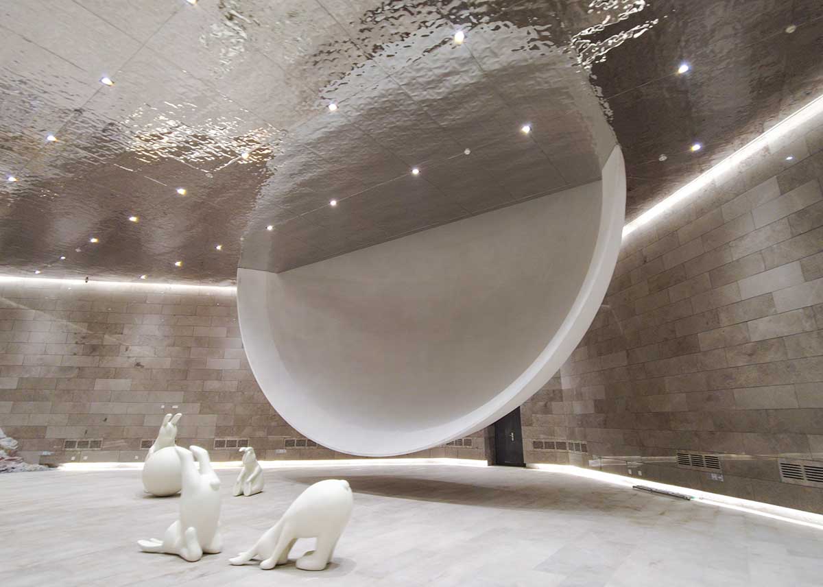 故鄉(xiāng)的月位于泰山九女峰鄉(xiāng)村旅游度假區(qū)東西門村,項(xiàng)目依山而建,傍水而立,建筑主體結(jié)構(gòu)與兩側(cè)的峭壁巧妙結(jié)合,半球通過水面的倒影映成了一輪圓月,也象征著四方游子對(duì)心中故鄉(xiāng)的獨(dú)特眷戀。故鄉(xiāng)的月劇場(chǎng)內(nèi)打造獨(dú)具魅力的沉浸式演出,在美輪美奐的多媒體技術(shù)中,彌漫著山水氣息,文化藝術(shù)的交融,跟隨月亮感受一場(chǎng)特別的時(shí)光之旅。