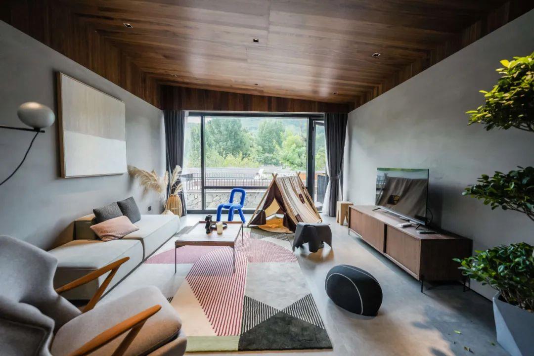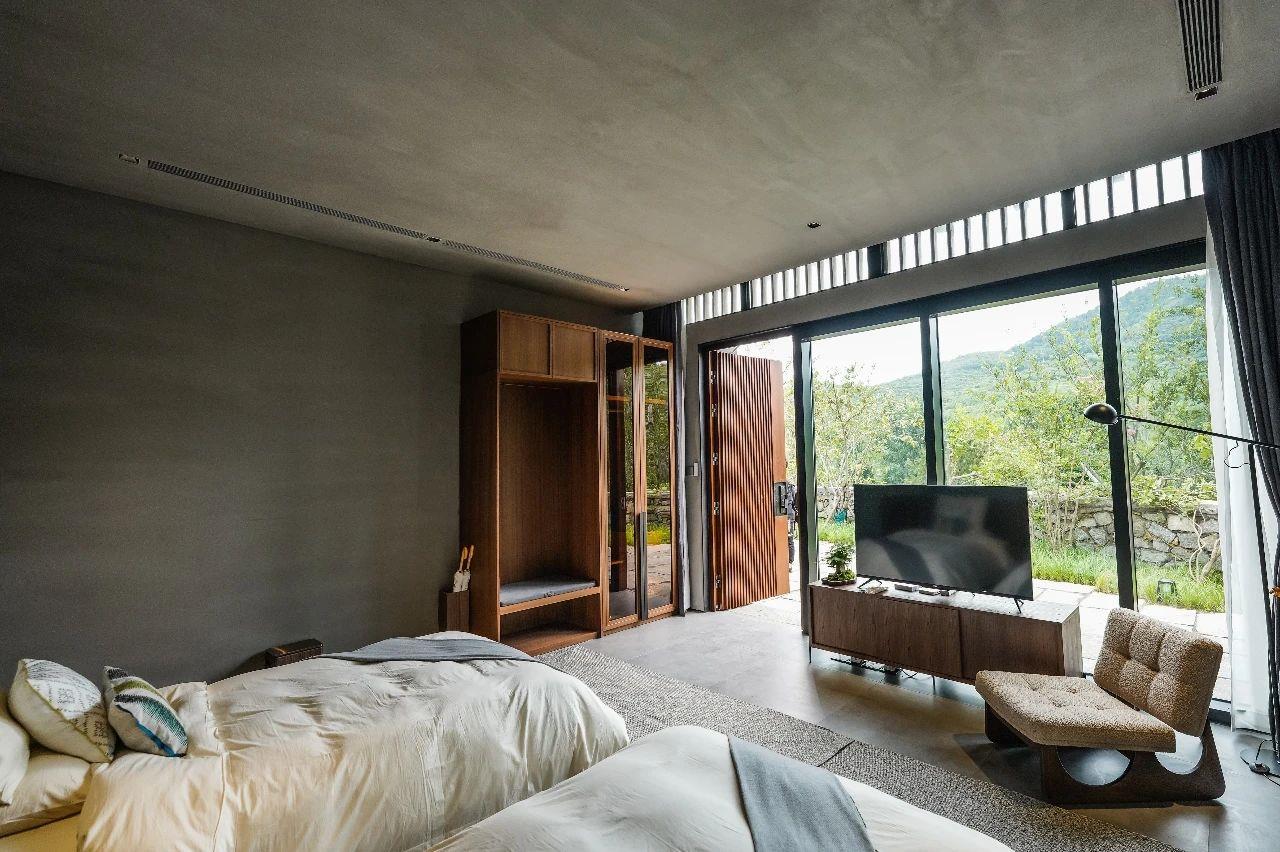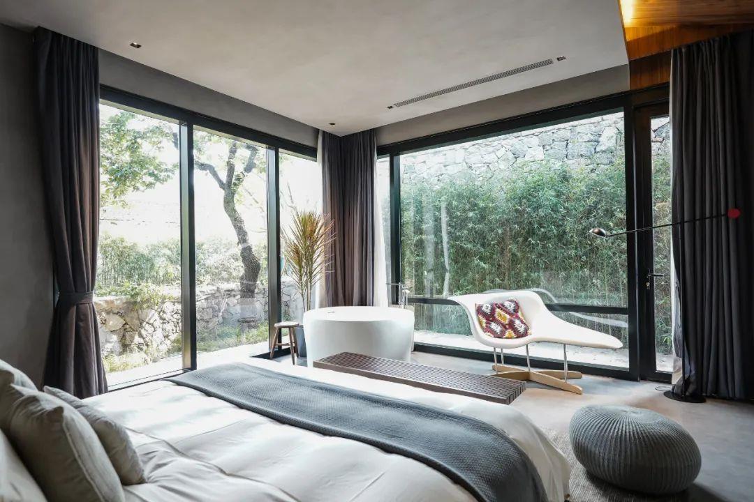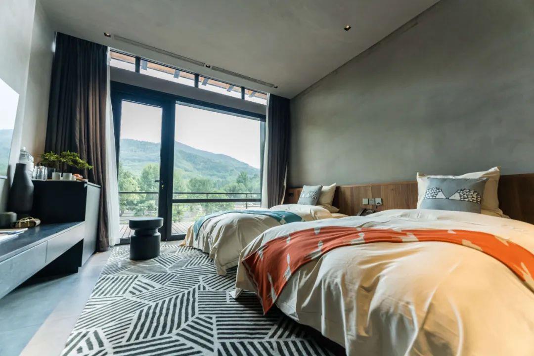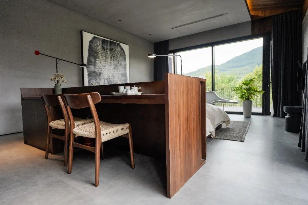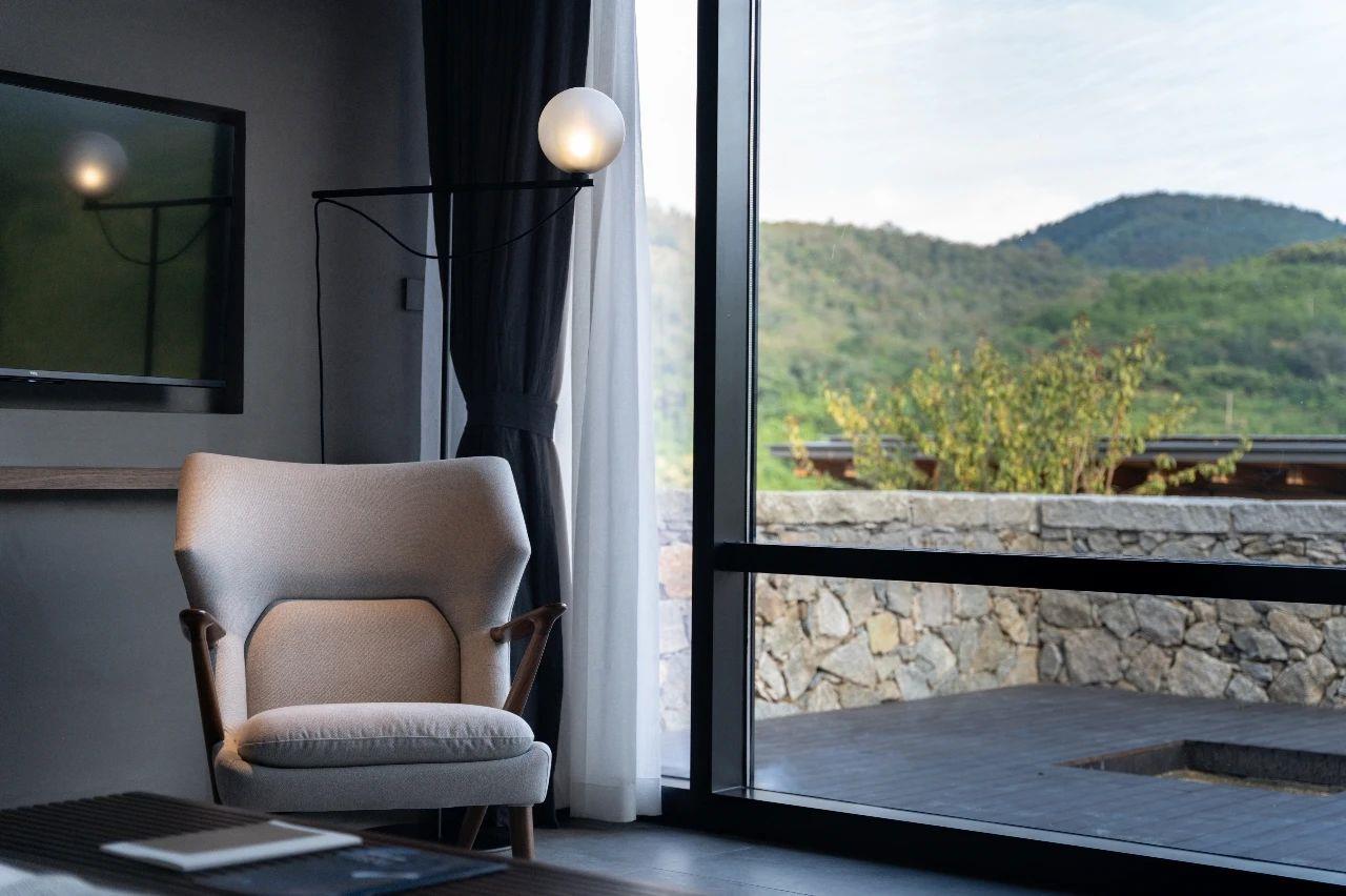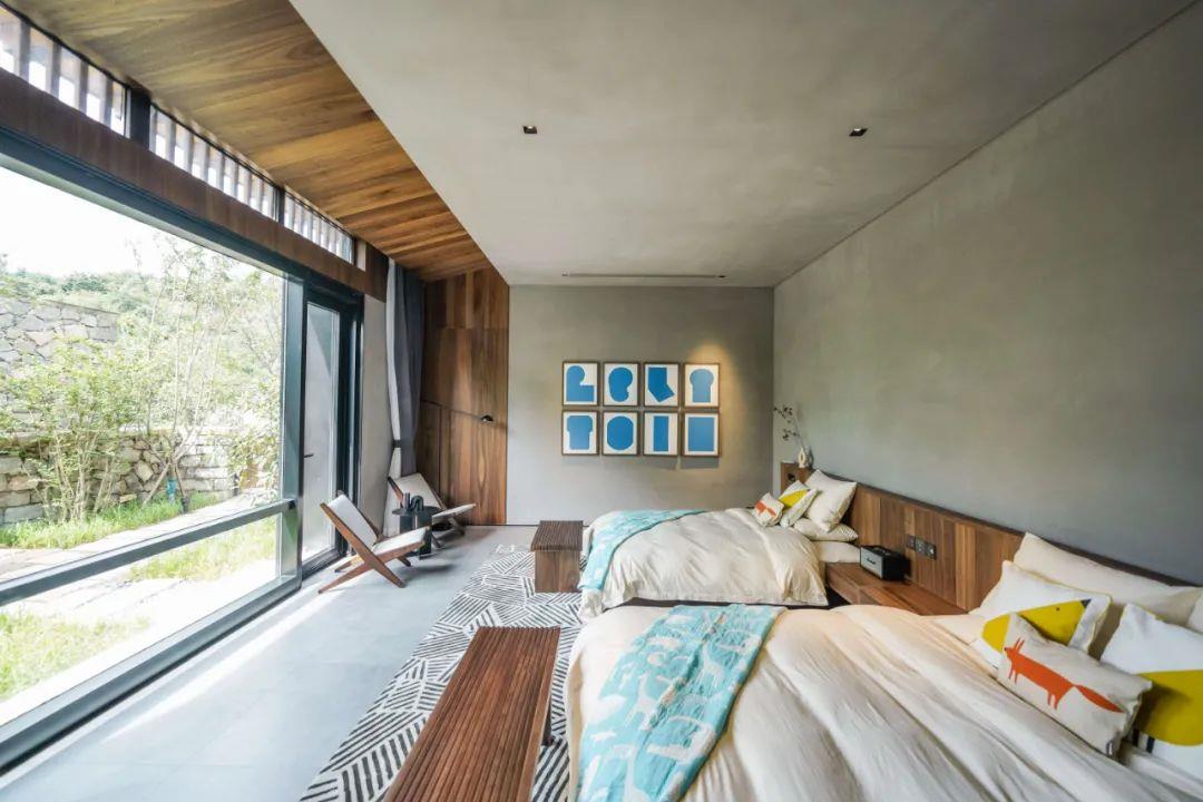 這里以設(shè)計(jì)輝映人性,以情懷觸底心靈。低調(diào)外觀隱身深山,復(fù)古場(chǎng)域締造完美度假時(shí)光。水泥墻、在地石材、木材橫梁、野奢感十足的復(fù)古場(chǎng)域。偏冷色的主色配以木質(zhì)家具,點(diǎn)綴出不浮躁的安穩(wěn)感。到處可見(jiàn)的圖書(shū)與文化產(chǎn)品,像從酒店里長(zhǎng)出來(lái)的一樣,從各個(gè)方向伸展、交錯(cuò),觸手可及都是書(shū)籍,目光所至盡是詩(shī)意。山林中整片綠意與光線(xiàn)透過(guò)大玻璃落地窗撒入房間,為這里注入自然與溫暖,新與舊、山與水、故鄉(xiāng)與遠(yuǎn)方的融合,極富靈魂。