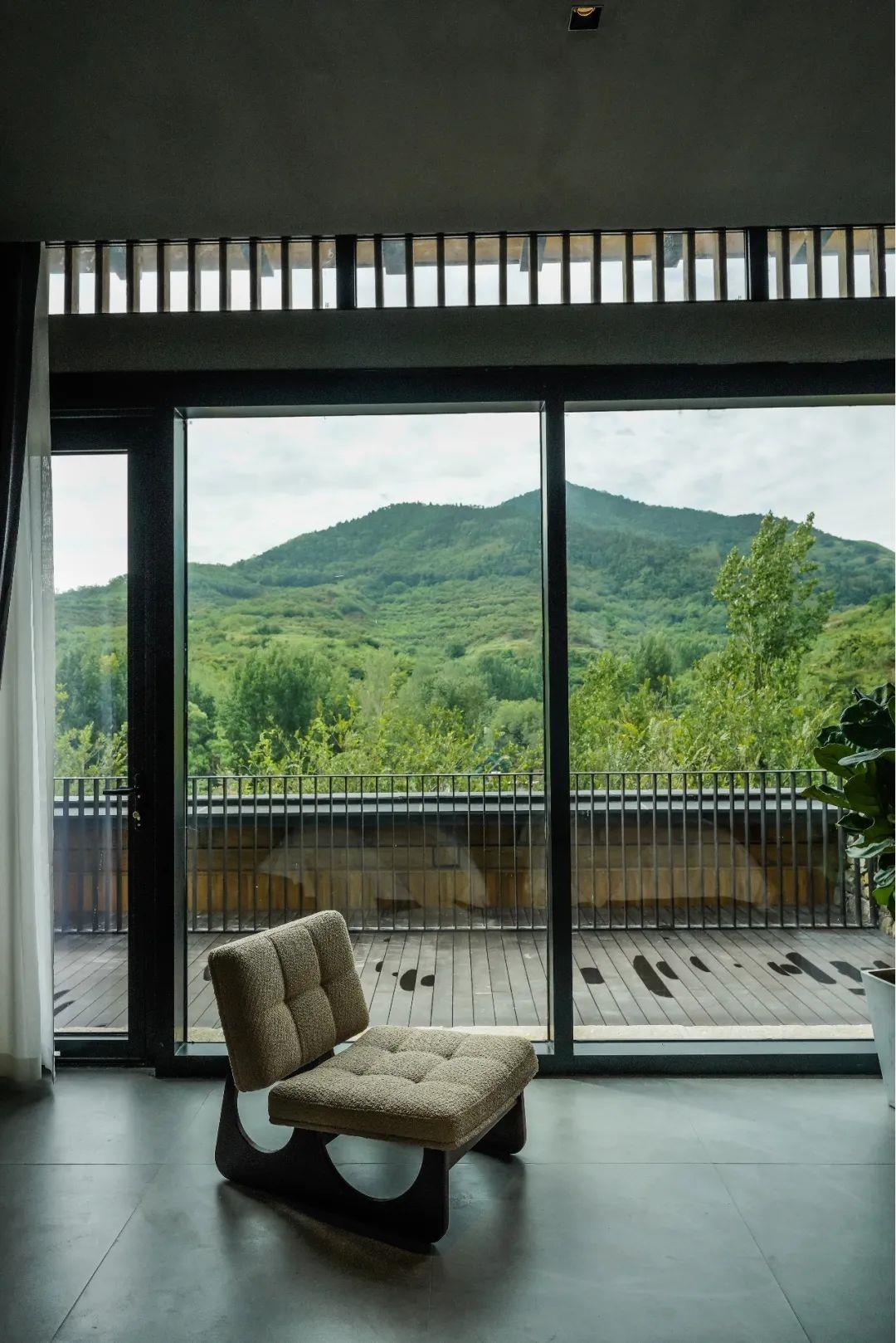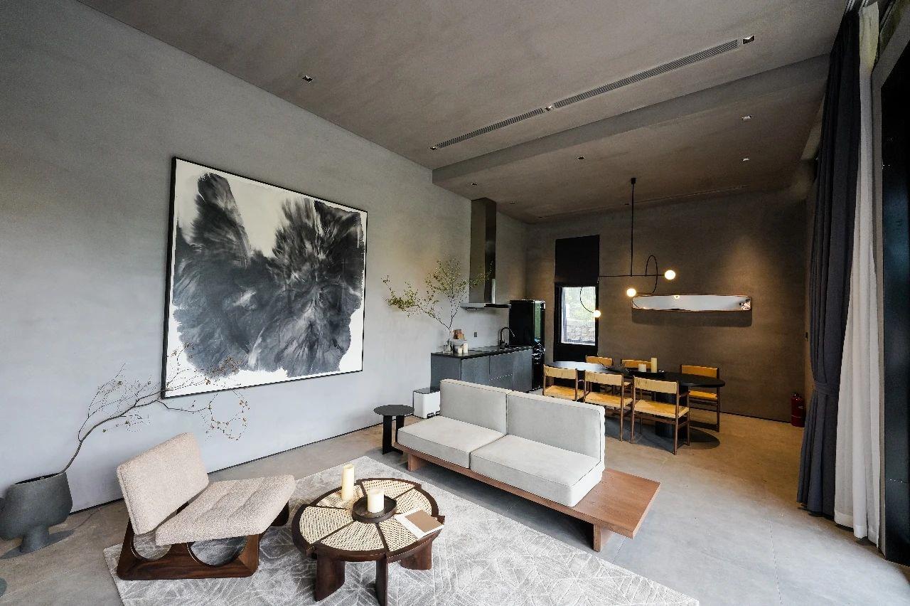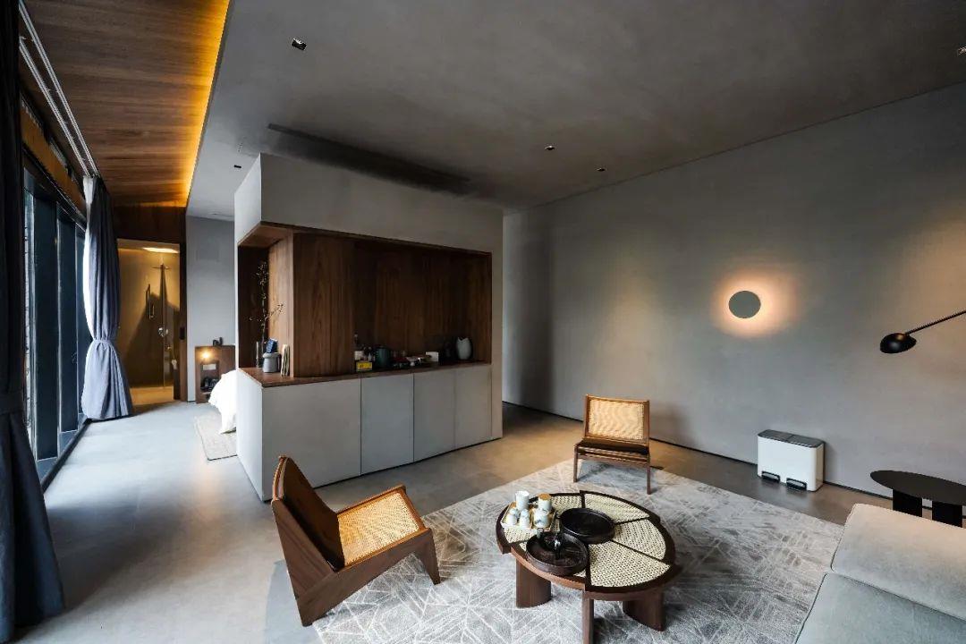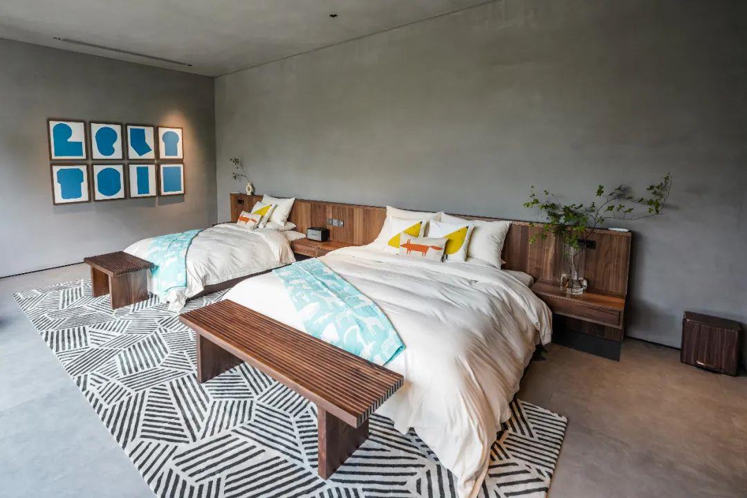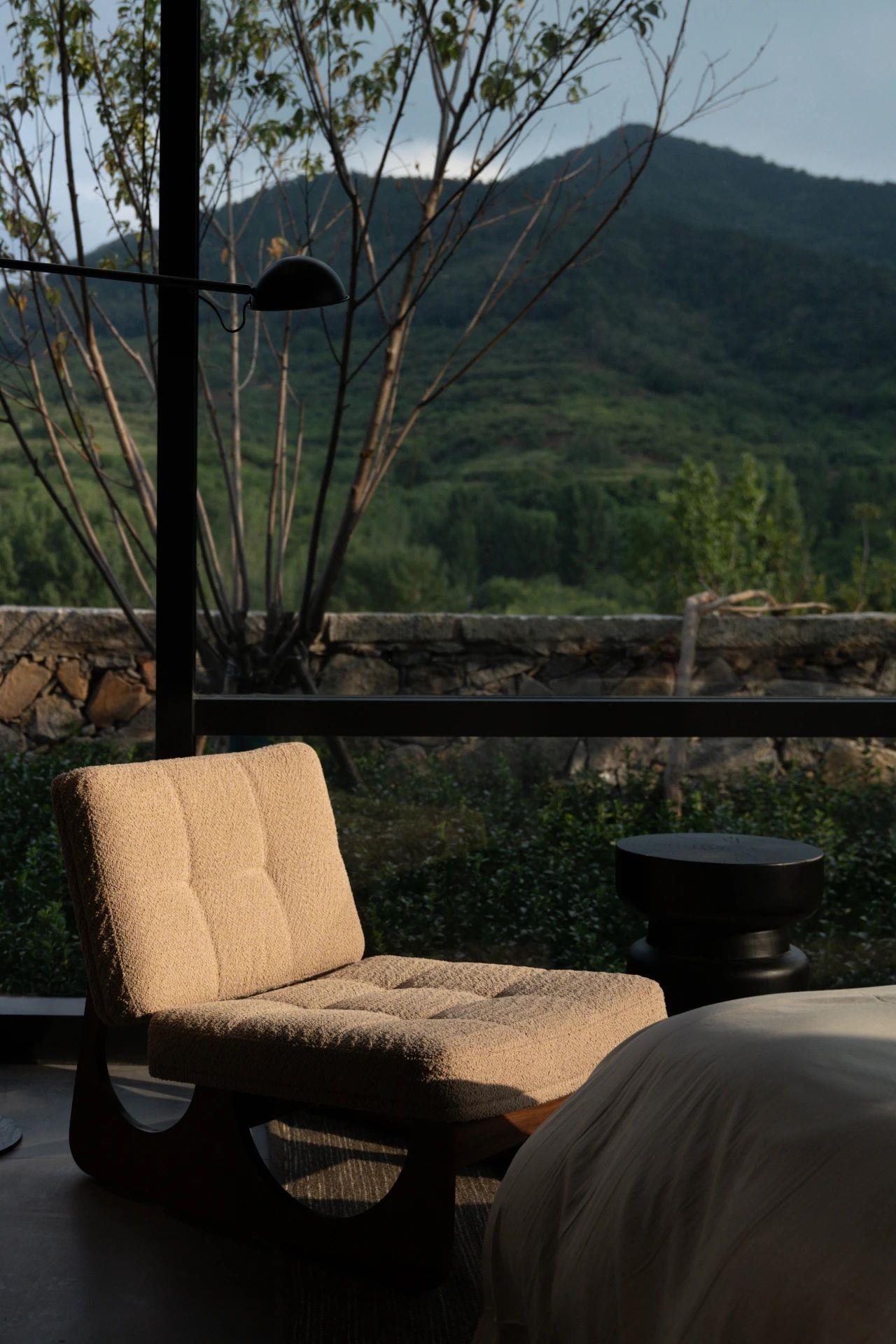 這里以設(shè)計(jì)輝映人性,以情懷觸底心靈。低調(diào)外觀隱身深山,復(fù)古場(chǎng)域締造完美度假時(shí)光。水泥墻、在地石材、木材橫梁、野奢感十足的復(fù)古場(chǎng)域。偏冷色的主色配以木質(zhì)家具,點(diǎn)綴出不浮躁的安穩(wěn)感。到處可見(jiàn)的圖書(shū)與文化產(chǎn)品,像從酒店里長(zhǎng)出來(lái)的一樣,從各個(gè)方向伸展、交錯(cuò),觸手可及都是書(shū)籍,目光所至盡是詩(shī)意。山林中整片綠意與光線(xiàn)透過(guò)大玻璃落地窗撒入房間,為這里注入自然與溫暖,新與舊、山與水、故鄉(xiāng)與遠(yuǎn)方的融合,極富靈魂。