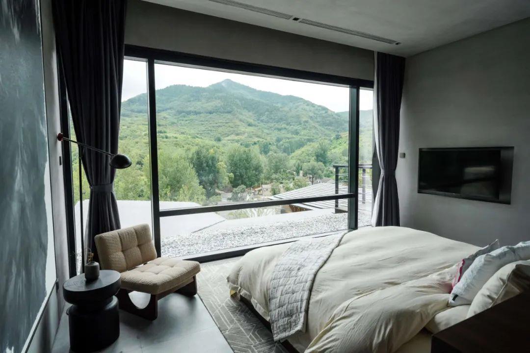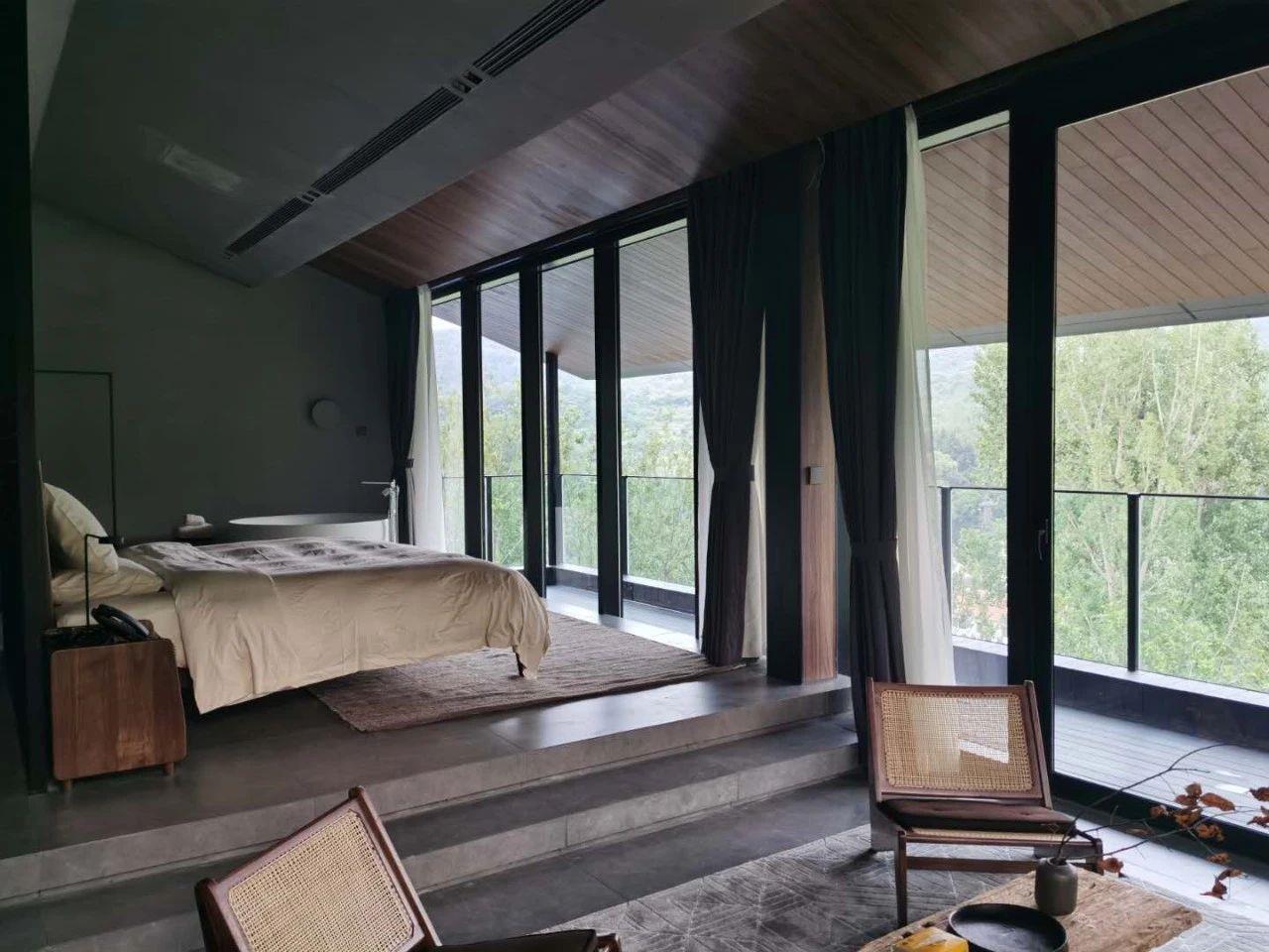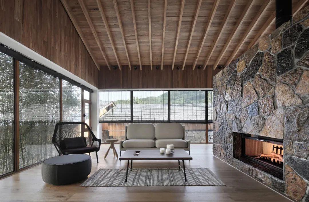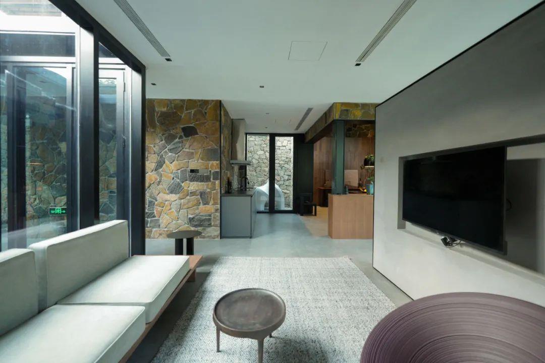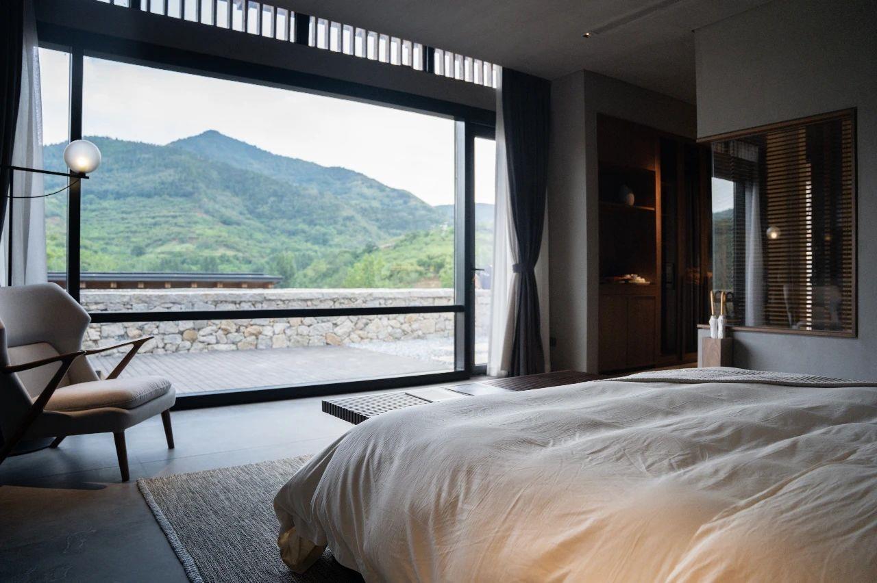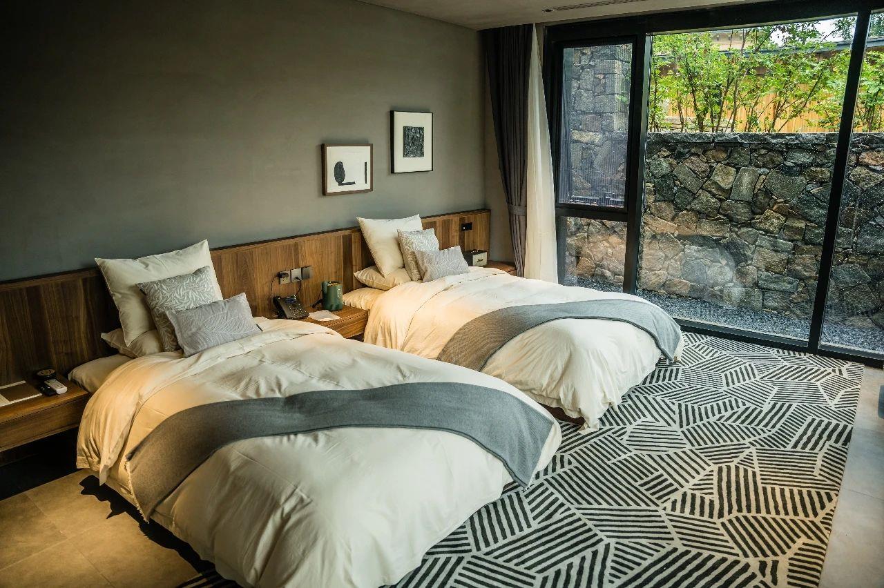 這里以設(shè)計(jì)輝映人性,以情懷觸底心靈。低調(diào)外觀隱身深山,復(fù)古場(chǎng)域締造完美度假時(shí)光。水泥墻、在地石材、木材橫梁、野奢感十足的復(fù)古場(chǎng)域。偏冷色的主色配以木質(zhì)家具,點(diǎn)綴出不浮躁的安穩(wěn)感。到處可見(jiàn)的圖書(shū)與文化產(chǎn)品,像從酒店里長(zhǎng)出來(lái)的一樣,從各個(gè)方向伸展、交錯(cuò),觸手可及都是書(shū)籍,目光所至盡是詩(shī)意。山林中整片綠意與光線(xiàn)透過(guò)大玻璃落地窗撒入房間,為這里注入自然與溫暖,新與舊、山與水、故鄉(xiāng)與遠(yuǎn)方的融合,極富靈魂。