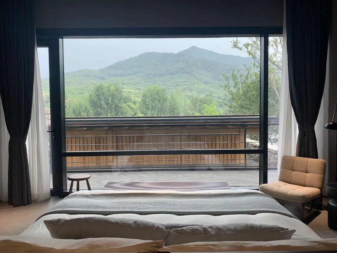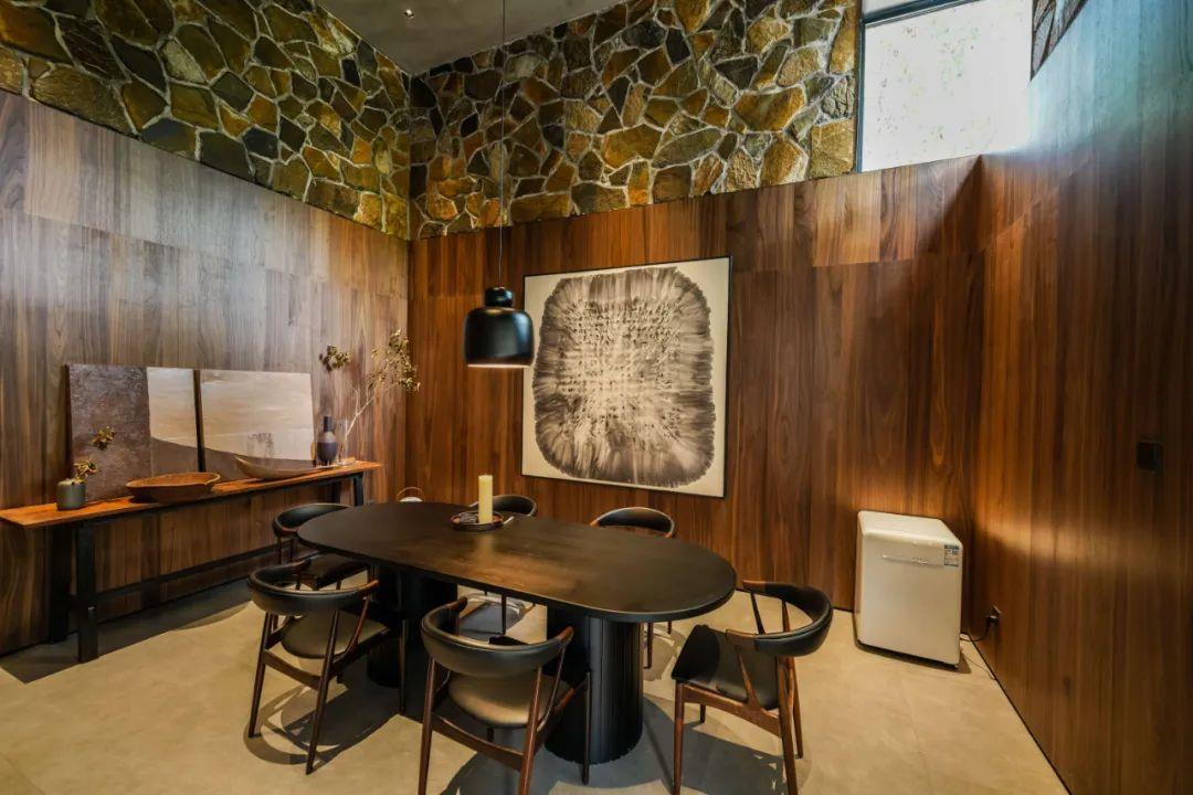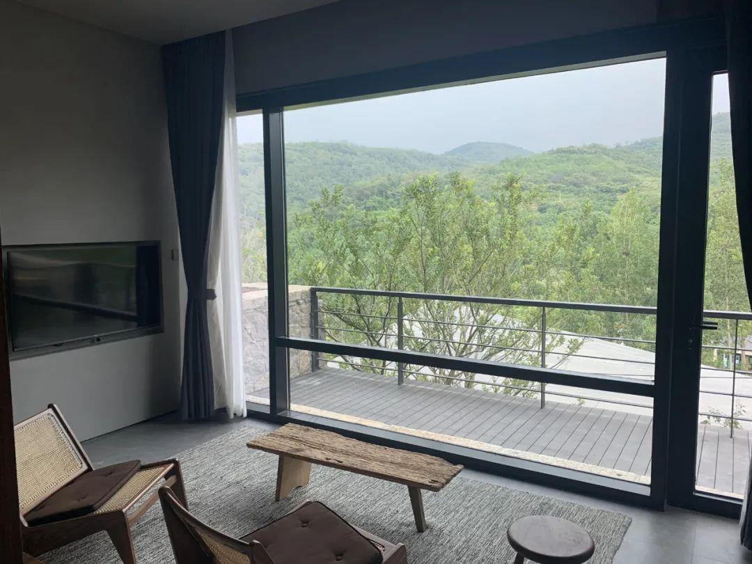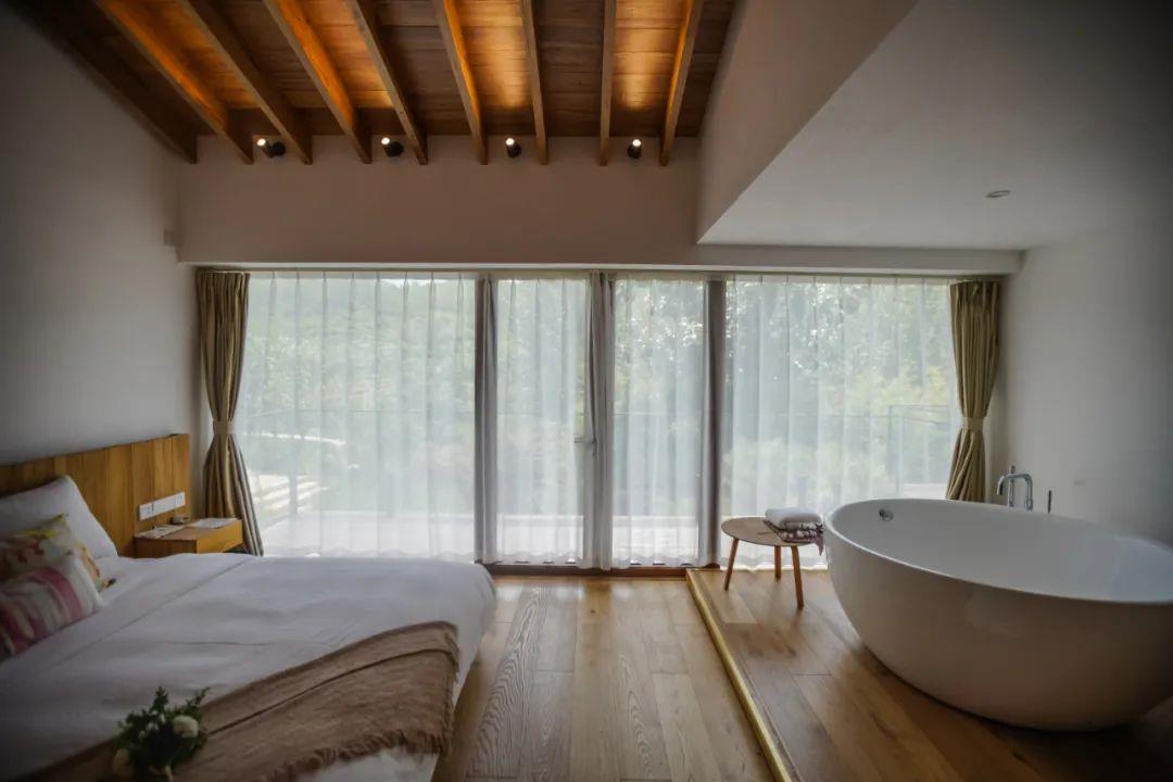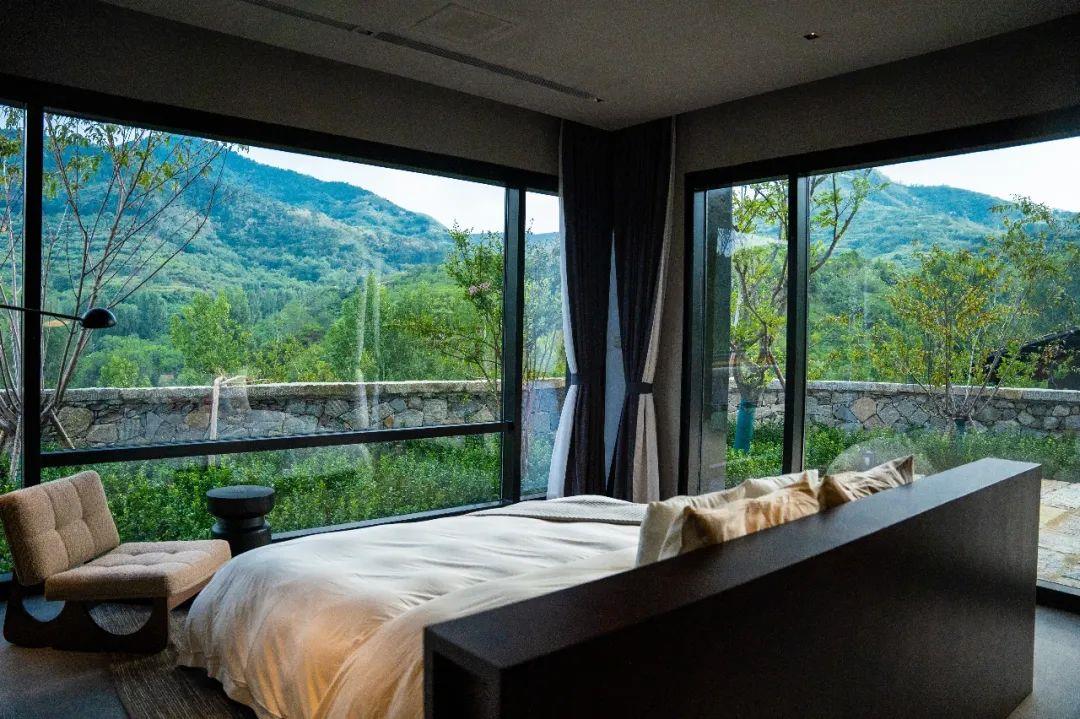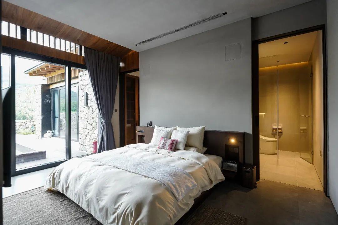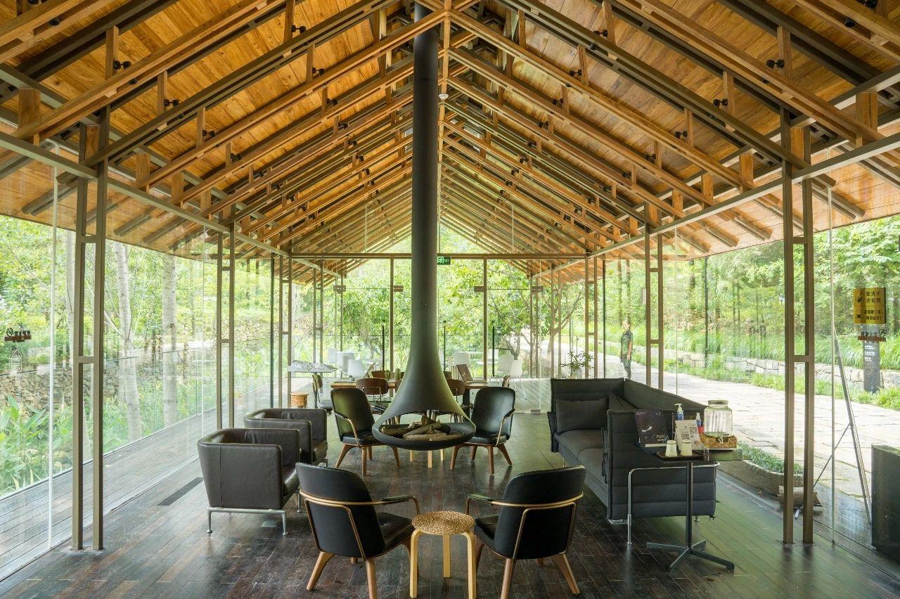這里以設(shè)計(jì)輝映人性,以情懷觸底心靈。低調(diào)外觀隱身深山,復(fù)古場(chǎng)域締造完美度假時(shí)光。水泥墻、在地石材、木材橫梁、野奢感十足的復(fù)古場(chǎng)域。偏冷色的主色配以木質(zhì)家具,點(diǎn)綴出不浮躁的安穩(wěn)感。到處可見(jiàn)的圖書(shū)與文化產(chǎn)品,像從酒店里長(zhǎng)出來(lái)的一樣,從各個(gè)方向伸展、交錯(cuò),觸手可及都是書(shū)籍,目光所至盡是詩(shī)意。山林中整片綠意與光線(xiàn)透過(guò)大玻璃落地窗撒入房間,為這里注入自然與溫暖,新與舊、山與水、故鄉(xiāng)與遠(yuǎn)方的融合,極富靈魂。