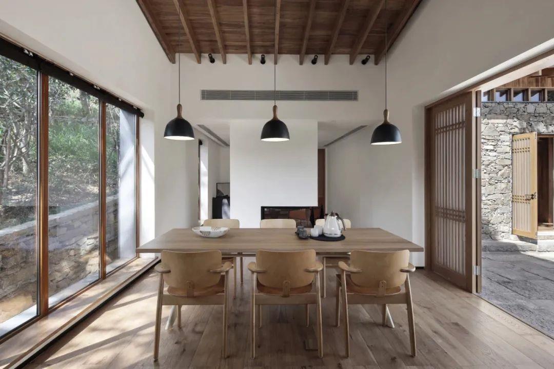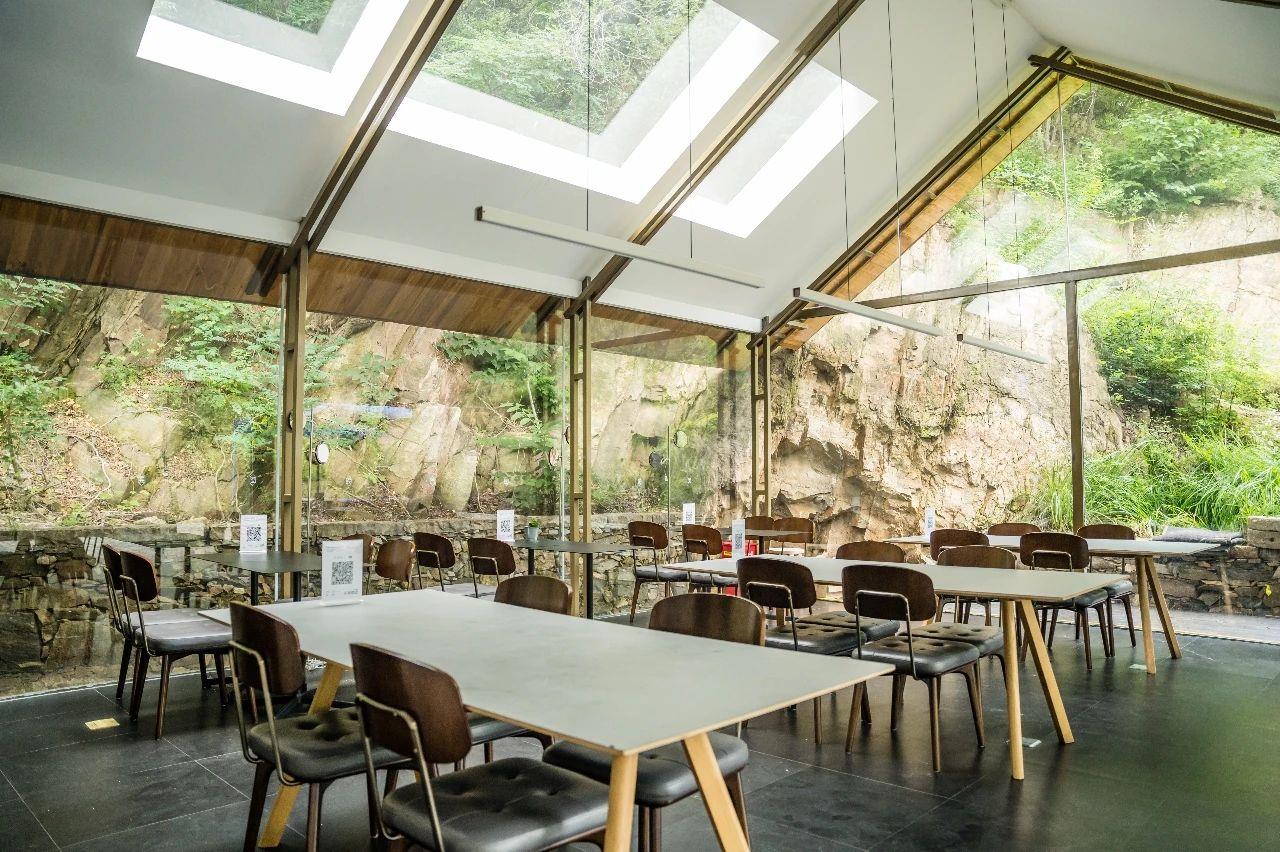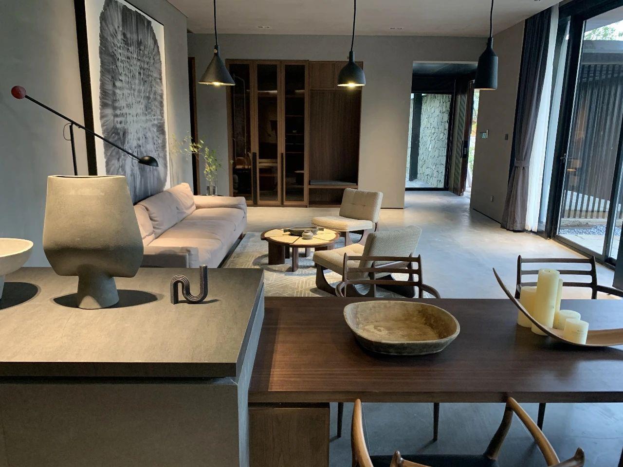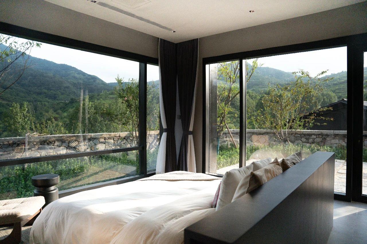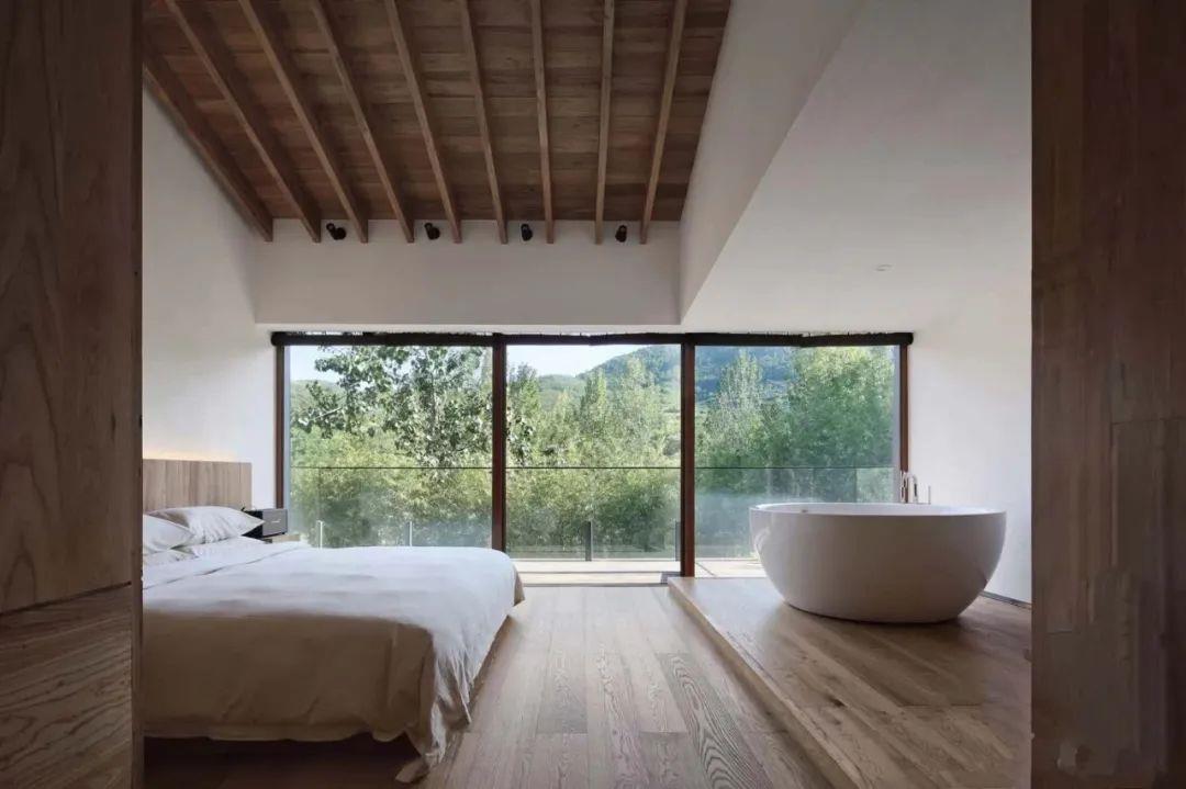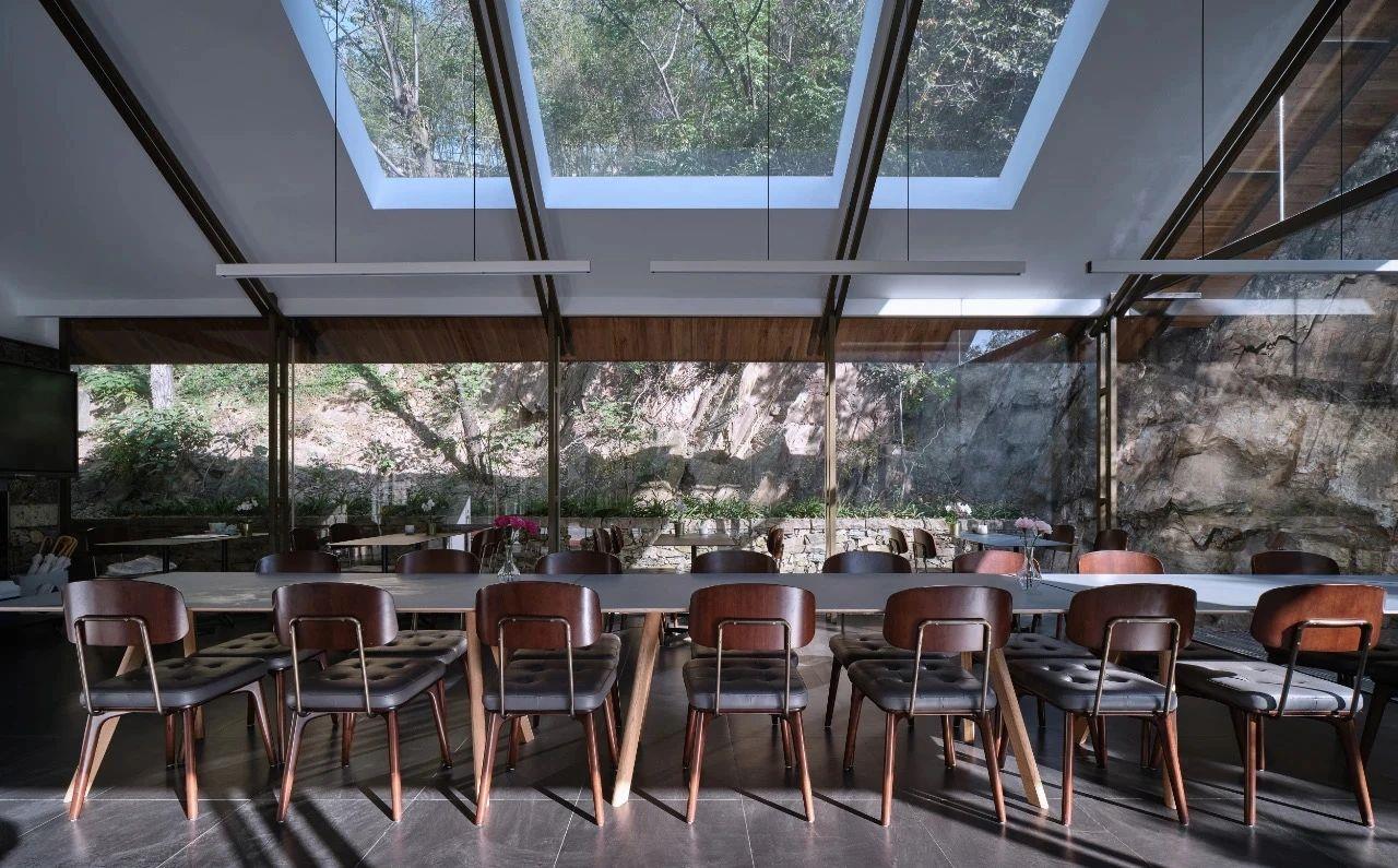 這里以設(shè)計(jì)輝映人性,以情懷觸底心靈。低調(diào)外觀隱身深山,復(fù)古場(chǎng)域締造完美度假時(shí)光。水泥墻、在地石材、木材橫梁、野奢感十足的復(fù)古場(chǎng)域。偏冷色的主色配以木質(zhì)家具,點(diǎn)綴出不浮躁的安穩(wěn)感。到處可見(jiàn)的圖書(shū)與文化產(chǎn)品,像從酒店里長(zhǎng)出來(lái)的一樣,從各個(gè)方向伸展、交錯(cuò),觸手可及都是書(shū)籍,目光所至盡是詩(shī)意。山林中整片綠意與光線(xiàn)透過(guò)大玻璃落地窗撒入房間,為這里注入自然與溫暖,新與舊、山與水、故鄉(xiāng)與遠(yuǎn)方的融合,極富靈魂。