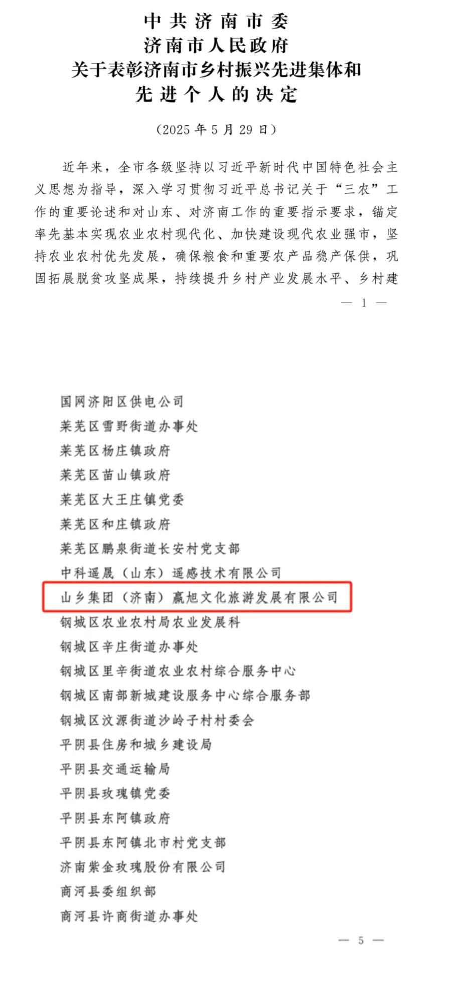 近日,濟南市委、市政府發(fā)布關(guān)于表彰濟南市鄉(xiāng)村振興先進集體和先進個人的決定,山東文旅山鄉(xiāng)集團權(quán)屬單位山鄉(xiāng)集團(濟南)嬴旭文化旅游發(fā)展有限公司(以下簡稱山鄉(xiāng)嬴旭文旅公司)榮獲“濟南市鄉(xiāng)村振興先進集體”稱號。