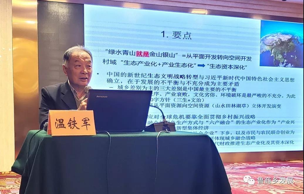 在題為《鄉(xiāng)村振興的關(guān)鍵:生態(tài)資源產(chǎn)業(yè)化及其資本深化》的演講中,溫鐵軍深刻剖析了“綠水青山就是金山銀山”的科學(xué)內(nèi)涵及廣泛實踐,他指出,踐行綠水青山就是金山銀山的理念就是要從平面開發(fā)轉(zhuǎn)向空間開發(fā),探索村域生態(tài)產(chǎn)業(yè)化+產(chǎn)業(yè)生態(tài)化,從而向生態(tài)資本深化。實施鄉(xiāng)村振興戰(zhàn)略是中國應(yīng)對全球挑戰(zhàn)的壓艙石,是針對國家生態(tài)文明轉(zhuǎn)型的基礎(chǔ)性戰(zhàn)略調(diào)整。在具體實踐中,要把一二三產(chǎn)融合的綠色生產(chǎn)方式與“六產(chǎn)融合”的生態(tài)產(chǎn)業(yè)化作為“產(chǎn)業(yè)興旺”的主要內(nèi)涵,重構(gòu)新型集體經(jīng)濟;要培養(yǎng)懂農(nóng)業(yè)、愛農(nóng)村、愛農(nóng)民的“社會企業(yè)”下鄉(xiāng),以及市民與農(nóng)民聯(lián)合創(chuàng)業(yè)為基礎(chǔ)的新鄉(xiāng)賢治理,通過鄉(xiāng)土百業(yè)發(fā)展體現(xiàn)城鄉(xiāng)融合戰(zhàn)略;政府要因地制宜創(chuàng)新三農(nóng)政策通過金融替代財政推進生態(tài)產(chǎn)業(yè)化及其資本深化。