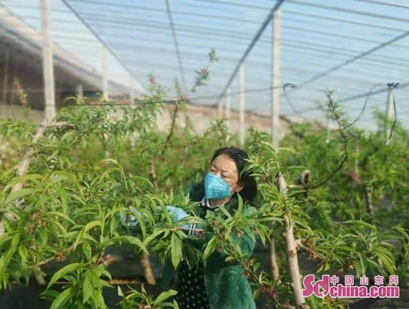 在白沙河街道林浩源油桃基地,村民正在管理油桃樹