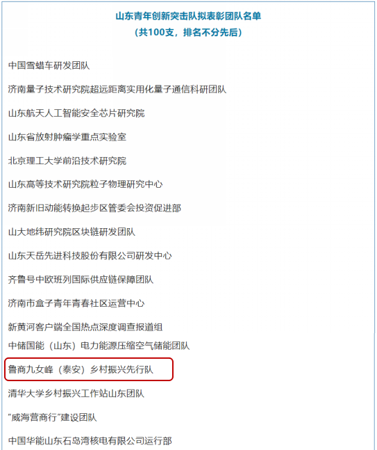 近日,團(tuán)省委、省青聯(lián)評(píng)選出100支“山東青年創(chuàng)新突擊隊(duì)”和100名“山東青年創(chuàng)新榜樣”。山鄉(xiāng)集團(tuán)有限公司九女峰(泰安)鄉(xiāng)村振興先行隊(duì)榮獲“山東青年創(chuàng)新突擊隊(duì)”稱號(hào)。此次評(píng)選,團(tuán)省委、省青聯(lián)圍繞促進(jìn)落實(shí)省委“十大創(chuàng)新”重點(diǎn)任務(wù),旨在挖掘、宣傳、展示全省各行業(yè)各領(lǐng)域勇于創(chuàng)新、敢為人先的優(yōu)秀青年典型,更好激發(fā)山東青年的創(chuàng)新智慧、創(chuàng)業(yè)激情和創(chuàng)優(yōu)動(dòng)力。