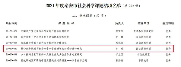 近日,泰安市社會科學(xué)界聯(lián)合會公布2021年度泰安市社會科學(xué)課題結(jié)項(xiàng)名單,山鄉(xiāng)集團(tuán)教育科技公司(以下簡稱“教育科技公司”)聯(lián)合泰山學(xué)院共同研發(fā)申報的重點(diǎn)課題《核心素養(yǎng)視域下泰安市中小學(xué)生研學(xué)旅行活動設(shè)計研究》通過專家評審驗(yàn)收,成功結(jié)項(xiàng)并被鑒定為“優(yōu)秀”。