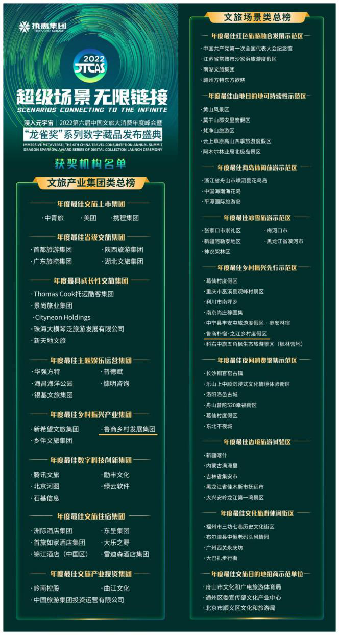 5月31日,第六屆中國文旅大消費(fèi)年度峰會暨“龍雀獎(jiǎng)”頒獎(jiǎng)盛典舉辦。經(jīng)過激烈角逐,山鄉(xiāng)集團(tuán)有限公司(原魯商鄉(xiāng)村發(fā)展集團(tuán))從眾多參選企業(yè)中脫穎而出斬獲“年度最佳鄉(xiāng)村振興產(chǎn)業(yè)集團(tuán)”獎(jiǎng)項(xiàng)。山鄉(xiāng)集團(tuán)旗下杭州之江鄉(xiāng)村度假區(qū)榮獲“最佳鄉(xiāng)村振興先行示范區(qū)”稱號。