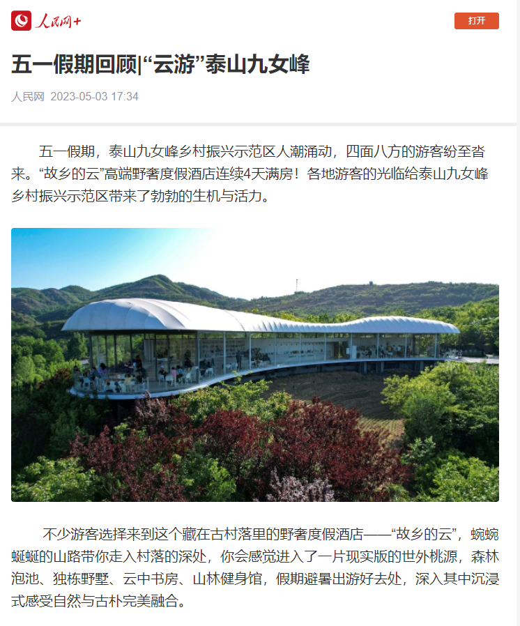 “五一”假期,山鄉(xiāng)集團(tuán)豐富的文旅產(chǎn)品引發(fā)央視新聞聯(lián)播、人民網(wǎng)等媒體關(guān)注報(bào)道。來自各地的游客也紛紛打卡小紅書、抖音等自媒體,為美麗風(fēng)景打call。泰山九女峰鄉(xiāng)村度假區(qū)登上央視《新聞聯(lián)播》,成為“多彩假期活動(dòng)豐富,節(jié)日消費(fèi)持續(xù)升溫”的典型代表。人民網(wǎng)也對假日期間九女峰項(xiàng)目人潮涌動(dòng)、游人如織的熱鬧場景進(jìn)行了持續(xù)報(bào)道。泰山九女峰鄉(xiāng)村度假區(qū)榮登抖音“泰安市客棧民宿熱銷榜”、攜程“精品民宿榜”雙榜第一;東泉鄉(xiāng)村度假區(qū)彩石東泉·山鄉(xiāng)后院入圍抖音“濟(jì)南市舒適酒店收藏榜”,熱度與人氣齊豐收。