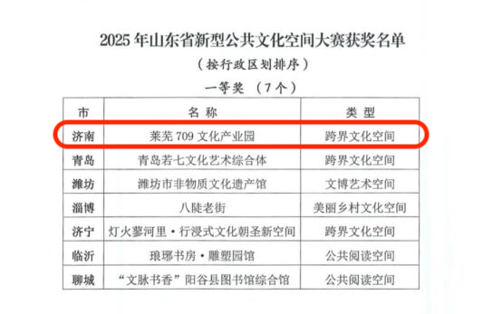 近日,山東省文化和旅游廳公布了2025年山東省新型公共文化空間大賽獲獎名單,山東文旅山鄉(xiāng)集團(tuán)運(yùn)營打造的709文化產(chǎn)業(yè)園榮獲一等獎。