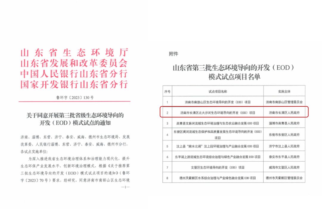 近日,省生態(tài)環(huán)境廳、省發(fā)改委、人民銀行山東分行、國家開發(fā)銀行山東分行聯(lián)合發(fā)布《關(guān)于同意開展第三批省級生態(tài)環(huán)境導(dǎo)向的開發(fā)(EOD)模式試點的通知》,確定全省8個項目開展EOD模式試點。由山鄉(xiāng)集團全過程技術(shù)支持的濟南市長清區(qū)北大沙河生態(tài)環(huán)境導(dǎo)向的開發(fā)(EOD)項目成功入選。